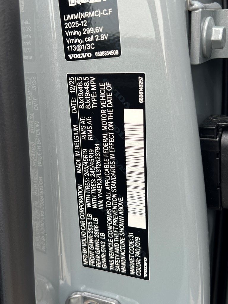 * **Technology & Connectivity:** 12.3" center touchscreen, 5G capability, wireless Apple CarPlay, NFC card and Digital Key Plus, wireless smartphone charging, USB-C ports front and rear, and Volvo Cars app with remote lock/unlock and remote start.